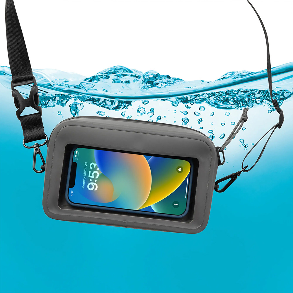 Wasserdichter Behälter für den Transport Ihres Telefons und anderer elektronischer Geräte. Die durchsichtige Vorderseite ermöglicht es Ihnen, Ihr Gerät zu benutzen, ohne es herauszunehmen. Es gibt auch Platz im Inneren, um Schlüssel, Bargeld oder ein kleines Survival-Kit zu tragen. Der mitgelieferte Gurt ermöglicht es Ihnen, den Behälter in eine Hüfttasche zu verwandeln.