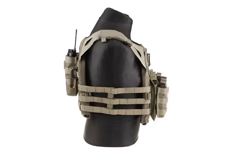 Die Weste besteht aus Nylon, das sie widerstandsfähig gegen Beschädigungen und Abrieb macht. Das Plate Carrier Design ermöglicht das Tragen von SAPI M ballistischen Platten, von denen weiche Dummys mitgeliefert werden. Der eingebaute Lader nimmt M4/M16- oder AK-Gewehre auf, die mit elastischen Gurten gegen Herausfallen gesichert sind. MOLLE-Gurte ermöglichen die Anbringung zusätzlicher Taschen, so dass die Weste je nach den Anforderungen des Benutzers konfiguriert werden kann.