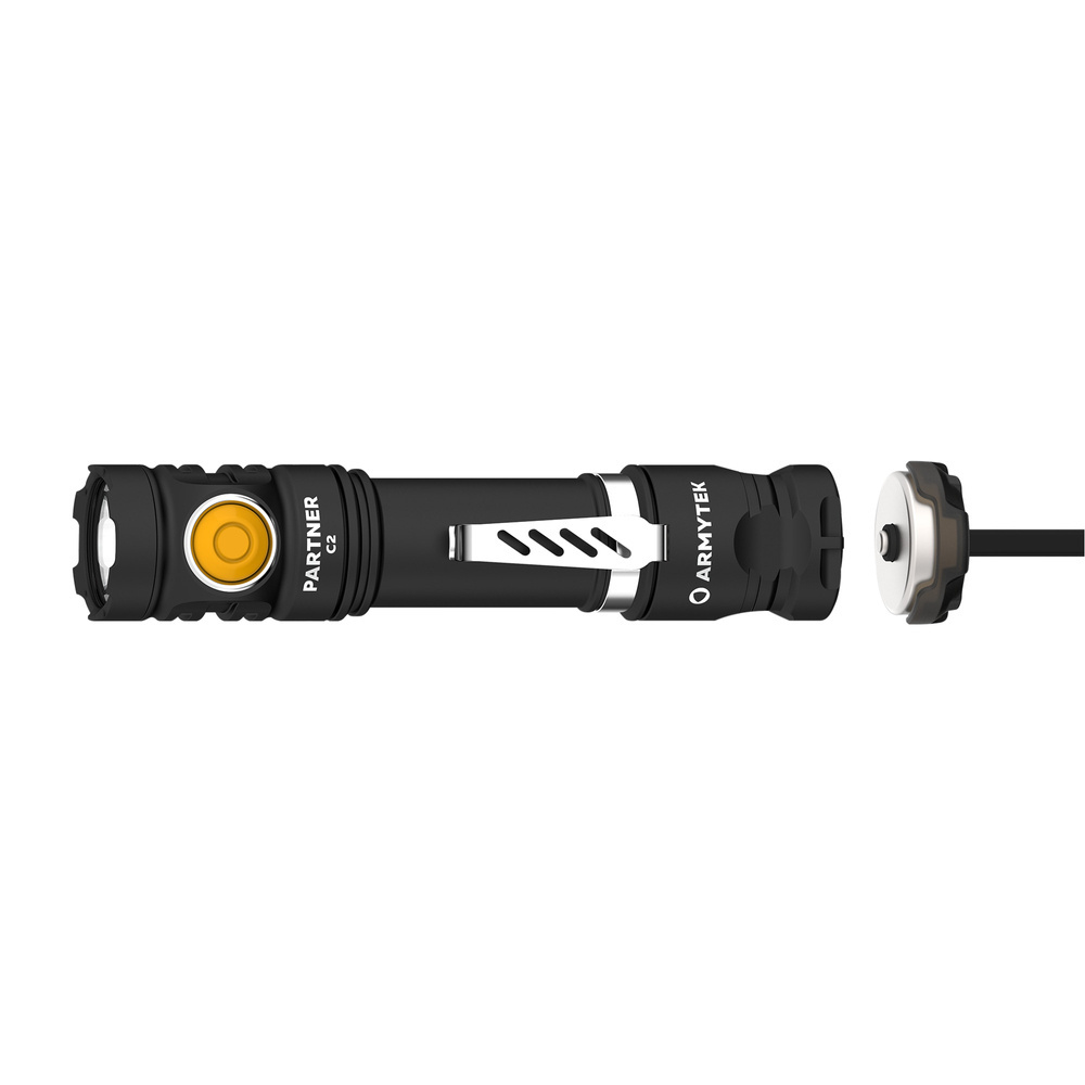 Die Partner C2 ist eine robuste taktische Taschenlampe mit kompakten Abmessungen. Die Taschenlampe wird mit einem abnehmbaren Edelstahlclip zur Befestigung an einem taktischen Gürtel, einem Paracord-Gurt mit Karabinerhaken, Ersatzdichtungen und einem magnetischen USB-Typ-A-Ladegerät geliefert.