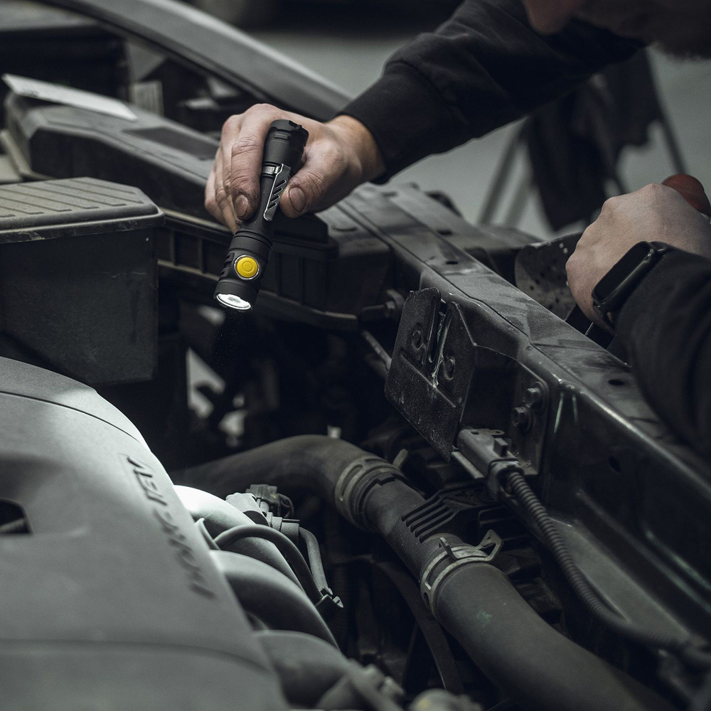 Der Batteriesockel ist durch eine doppelte Dichtung geschützt, was zu einer wasserdichten Zertifizierung nach IP68 führt. Bei einer Entfernung von 100 Metern beträgt der Durchmesser des Lichtflecks 12 Meter. Die zentrale Beleuchtung der Taschenlampe deckt einen Radius von 7° ab und die seitliche Beleuchtung deckt 68° ab. Widerstandsfähig gegen Staub, Wasser und Stürze aus bis zu 10 Metern Höhe. Die Linse aus gehärtetem Glas sorgt für eine bessere Raumausleuchtung.