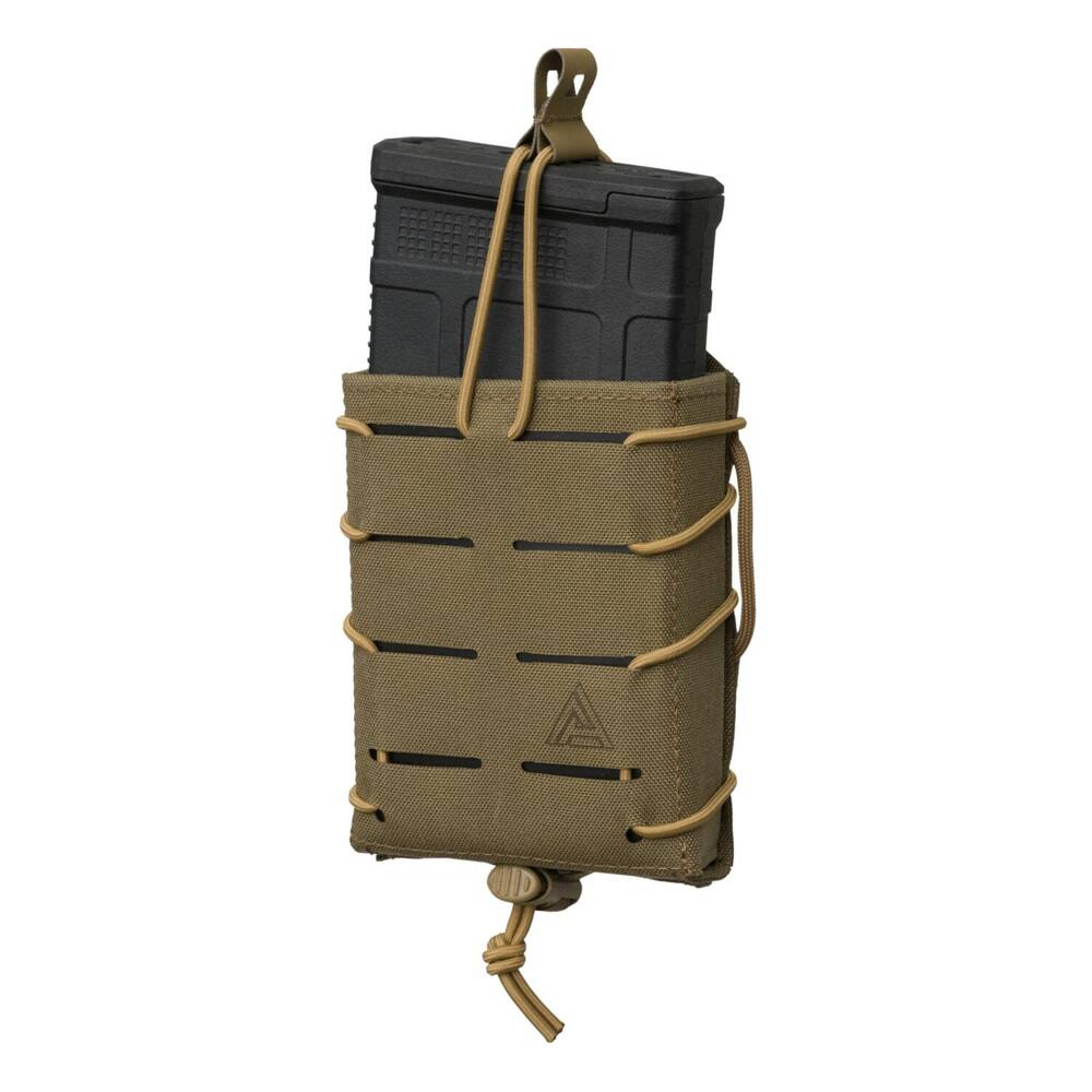 Eine offene Tasche mit Bungee Cord Halterung von Direct Action. Sie dient zum Transport eines einzelnen Gewehrmagazins für Munition im Kaliber .308 Win oder 7.62x51mm NATO. Die Tasche besteht aus Nylon-Laminatplatten, die mit lasergeschnittenem 500D Cordura-Gewebe überzogen sind. Die gesamte Länge der Tasche ist mit einem Gummizug versehen, der mit einer Perle für die Einstellung der Retention versehen ist.
