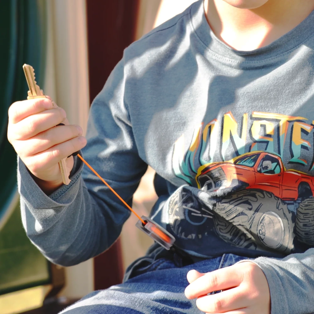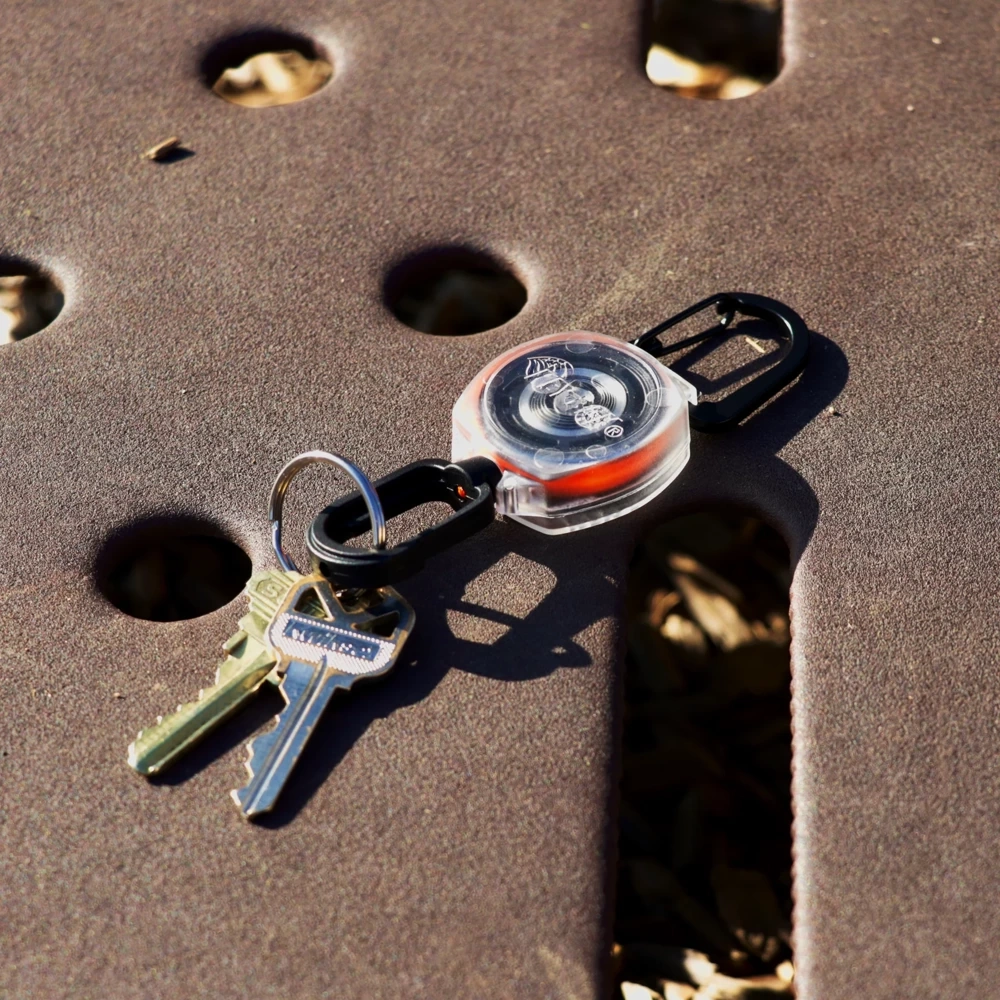 Ein kompakter Retraktor mit einem modernen Touch. Durch die Verwendung eines transparenten Gehäuses und einer leuchtend farbigen Kordel wird ein leicht erkennbares Gerät geschaffen, an dem man z. B. Schlüssel tragen kann. Der Retraktor selbst lässt sich leicht an den in Rucksäcken beliebten D-Ringen befestigen. Er wird mit einem Aluminium-Karabinerhaken eingehängt, und Gegenstände können an einem Polymerhaken festgehalten werden. Er zieht gezogene Gegenstände sicher zurück.