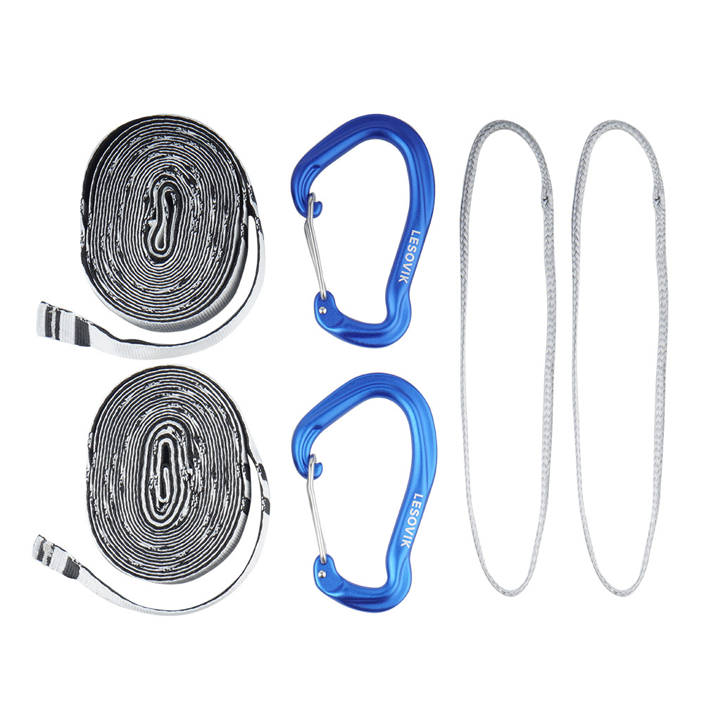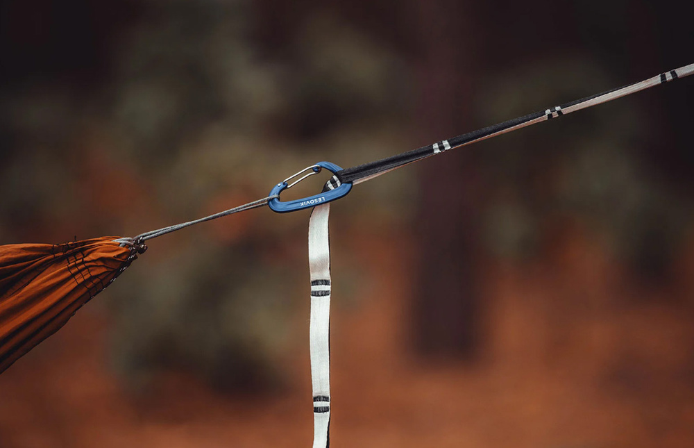 SNEKA Aufhängeset mit Gurtband, Schlaufen und Karabinerhaken von Lesovik. Die Aufhängung ermöglicht es Ihnen, die Hängematte intuitiv, effizient und ohne zusätzliche Knoten zu befestigen. Die Leinen und das Gurtband sind aus Dyneema-Gewebe gefertigt und haben eine Festigkeit von 660 kg bei einer empfohlenen Belastung von etwa 250 kg.