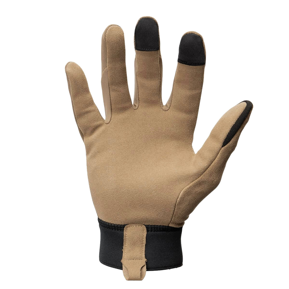Die Innenseite der Handfläche ist mit synthetischem Wildleder bezogen, das im Notfall zum Abwischen beschlagener Optiken oder Schießbrillen verwendet werden kann. Die Daumenspitze sowie der Zeige- und Mittelfinger jeder Hand sind mit einem Material überzogen, das die Bedienung von Touchscreens ermöglicht. Der Handrücken besteht aus gewebtem Nylon, das sich nahtlos in die Handbewegungen einfügt.