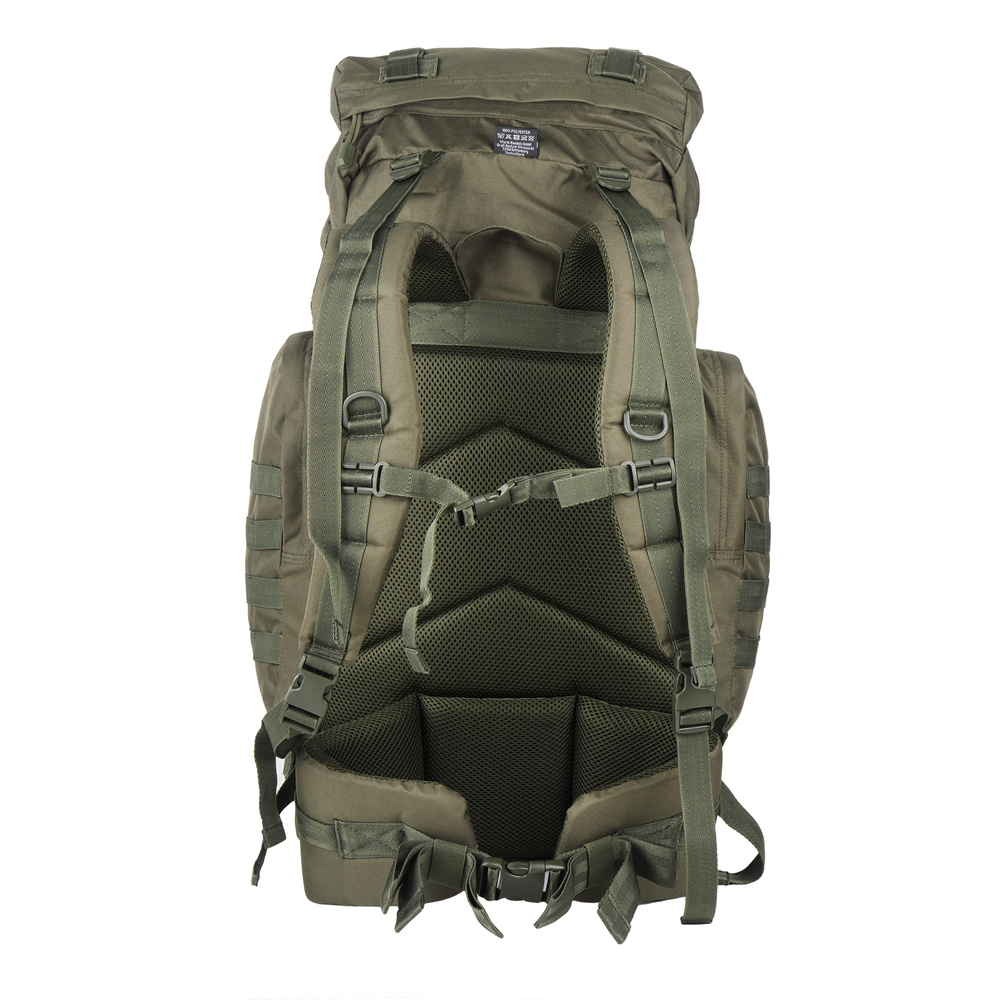 BW Kampfrucksack Rucksack mit einem Design, das das Ergebnis der Umsetzung von Bundeswehr-Erfahrungen in die Praxis von Mil-Tec ist. Das Tragesystem, bestehend aus spannungsverstellbaren Schultern, sowie Hüft- und Brustgurt, ermöglicht eine gleichmäßige Verteilung des getragenen Gewichts. Zusätzlich verbessert der Einsatz von belüftetem Netzgewebe an Rücken und Schultern den körperlichen und thermischen Komfort des Nutzers.