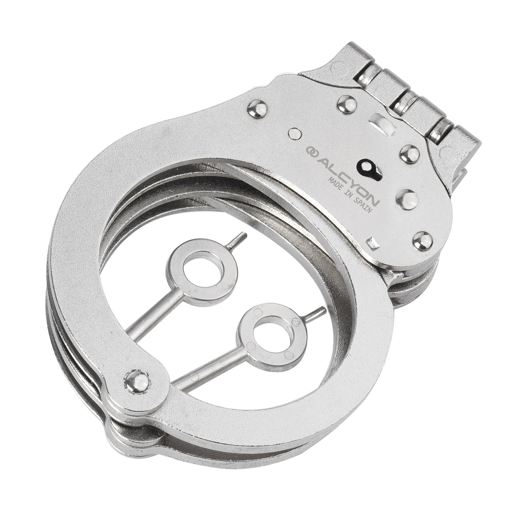 • Alcyon Stahlhandschellen mit doppeltem Verriegelungsmechanismus. Hergestellt aus K-70 Stahl, verfügt jede Handschelle über einen eigenen Verriegelungsmechanismus mit drei Zahnreihen. Verbindung: Scharnier. Farbe: Silber.