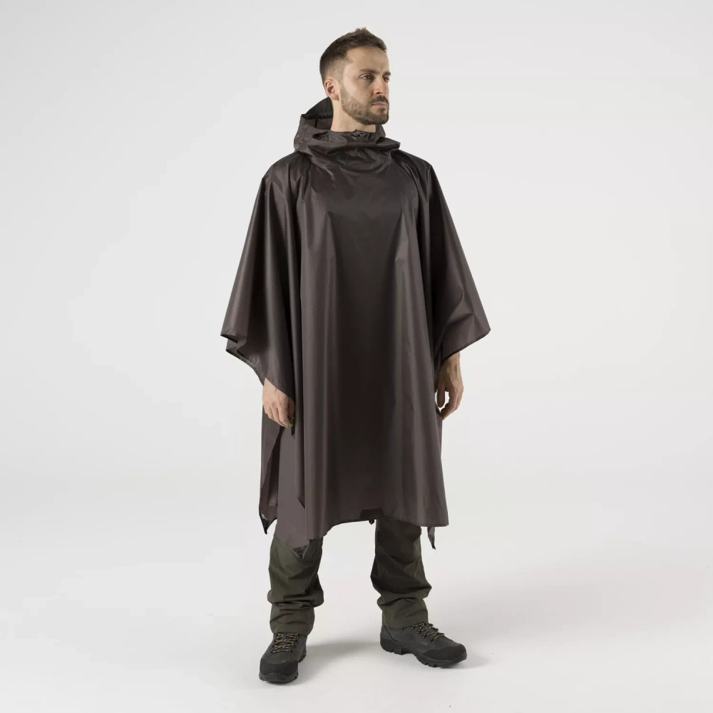 Der Poncho ist vollständig aus Ripstop-Polyester mit einer ausgeprägten Webart hergestellt. Alle Befestigungspunkte sind zum Schutz vor dem Zerreißen verstärkt worden. Das Cape wird mit einer Tasche mit eigenem Kordelzug geliefert, die es ermöglicht, den zusammengefalteten Poncho auch mit einem Wanderrucksack kompakt zu tragen.