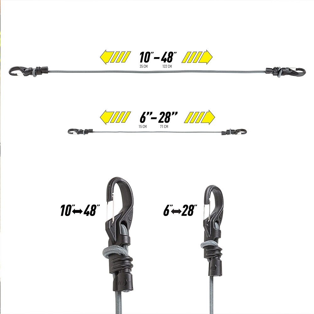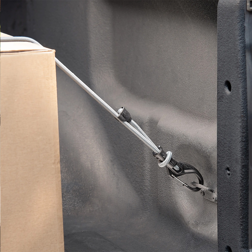 Nehmen Sie zum Beispiel unser KnotBone Adjustable Bungee. Mit Karabinerklemmen anstelle von offenen Haken an jedem Ende lässt es sich nicht nur an Ihren Ankerpunkten befestigen, sondern auch dort verriegeln. Anstelle eines Gummibandes, das mit der Zeit seine Dehnbarkeit verliert, hat das KnotBone Bungee eine haltbare, hochwertige Schnur, die durch jedes Ende gefädelt wird und sich von 48” bis 10\" in der Größe #9 und von 28” bis 6” in der Größe #5 einstellen lässt. Sobald Sie die richtige Länge eingestellt haben, befestigen Sie es mit einer einfachen Wrap-and-Lock-Bewegung. Wir haben sogar kleine selbstklemmende Plastikkappen an den Kabelenden angebracht, damit sie an Ort und Stelle bleiben, sobald Sie Ihre Ladung gesichert haben. Kein Ziehen, Dehnen und erneutes Einhaken mehr, um die gewünschte Spannung zu erhalten—Job für Job bleibt das KnotBone Bungee genau dort, wo Sie es anbringen, zieht sicher auf die exakte Länge, die Sie benötigen, und verriegelt dort.